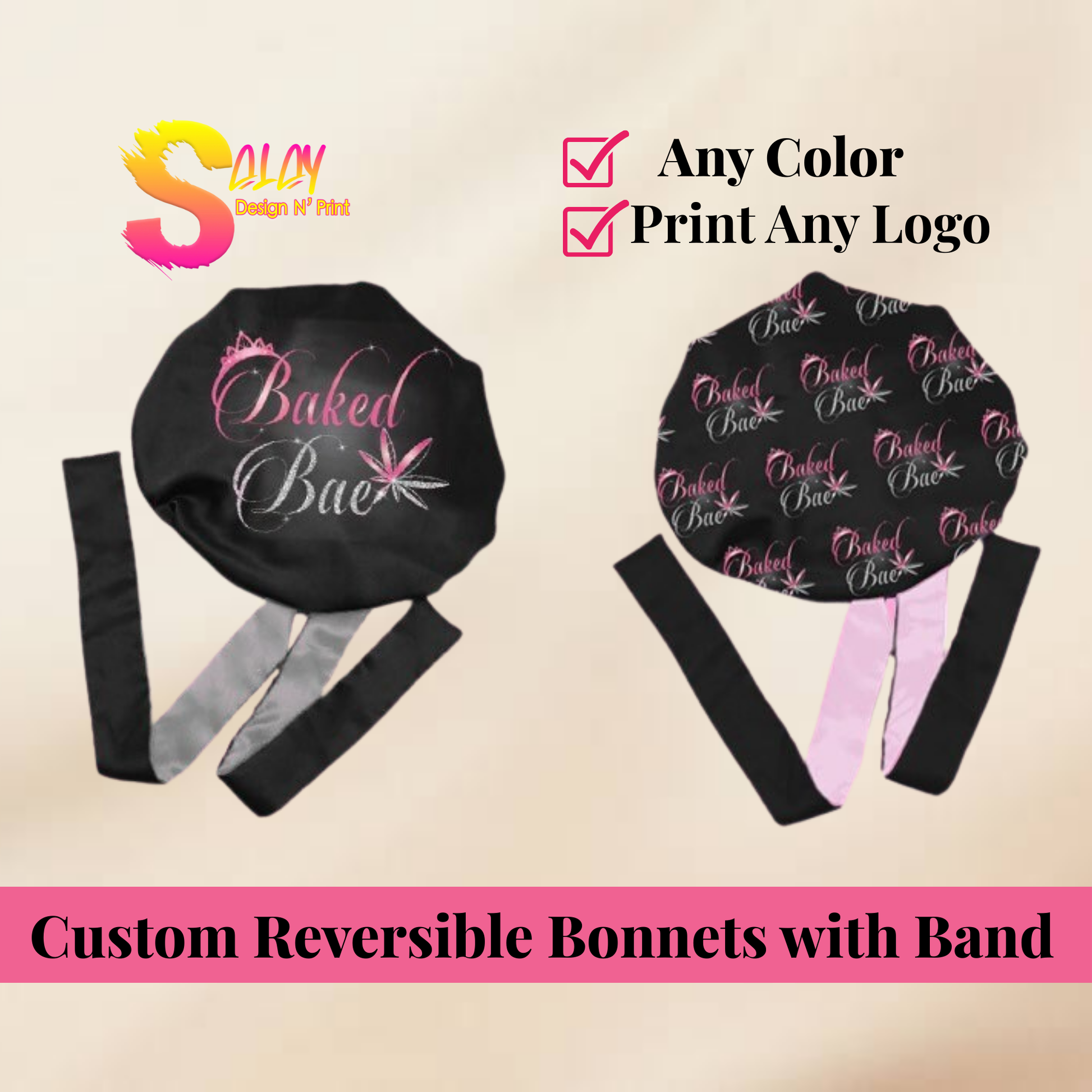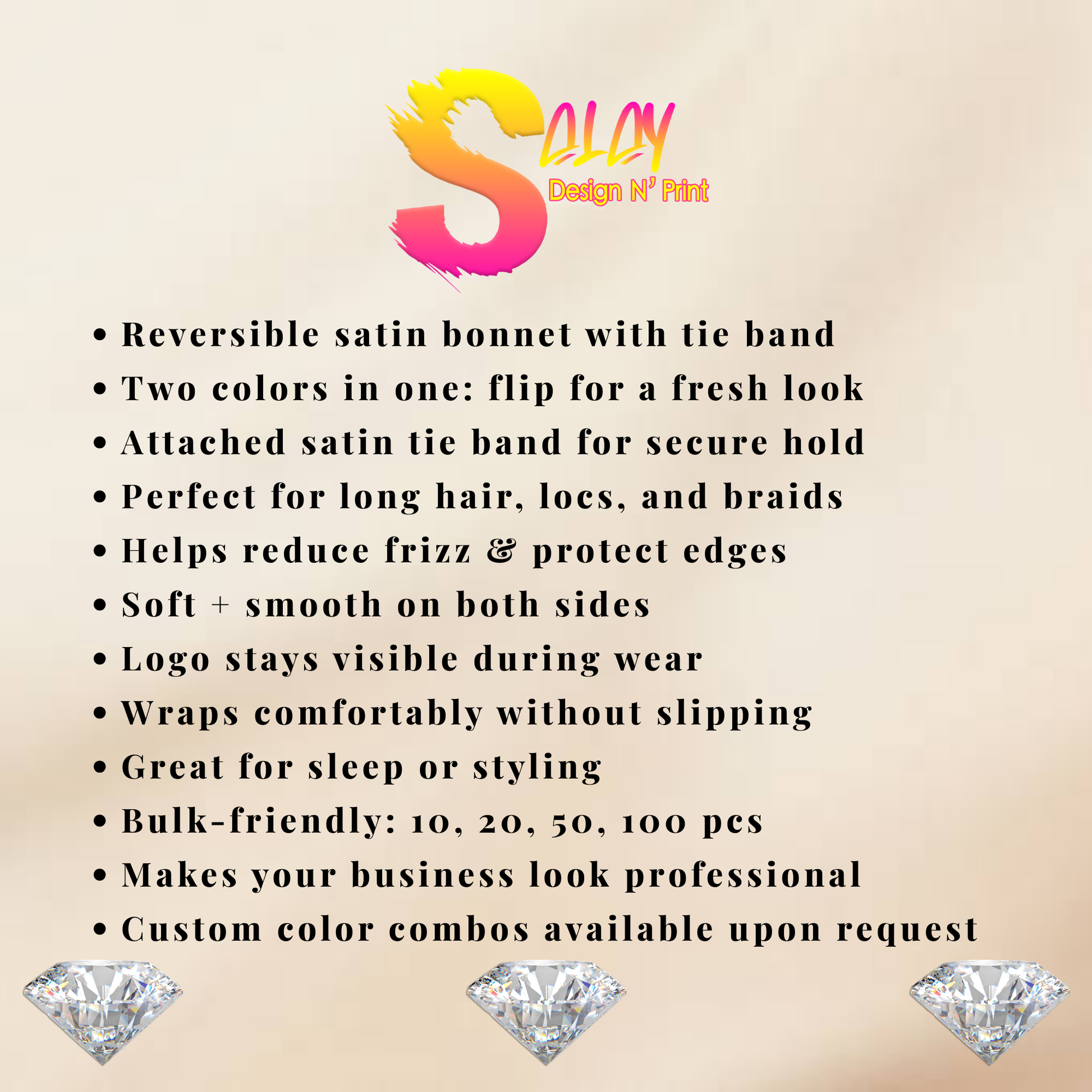 This luxurious and exclusive custom reversible bonnet with a long tie band is designed to protect your crown of natural hair and keep your style lasting longer, while also locking in moisture to reduce frizz. Choose from an array of colors, and personalize with your logo or image.